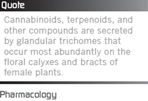 Cannabinoids, terpenoids, and other compounds are secreted by glandular trichomes that occur most abundantly on |