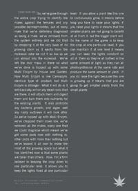 The first part of the book is an extensive documented graphical pictorial grow guide based on a 6 hour DVD set made whilst working on behalf of the University of London. This University holds a Home Office License to cultivate cannabis for medical research. The doctors, without sounding cruel, are not botanically blessed with green fingers so some 5 years ago we were called upon to help design, construct, and install a fully operational hydroponics grow room. We were then asked to help grow top quality cannabis for the University to ensure high active ingredients for their medical studies. As well as educating them on the finer art of growing plants hydroponically, we got to test certain methods and techniques, shifting the shit from shinola so we got to expose the fact from fiction.